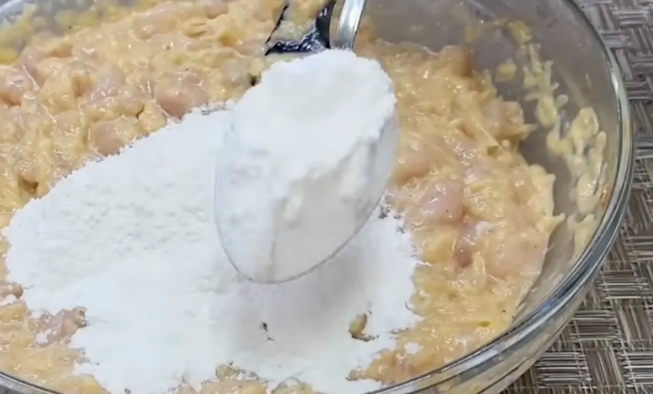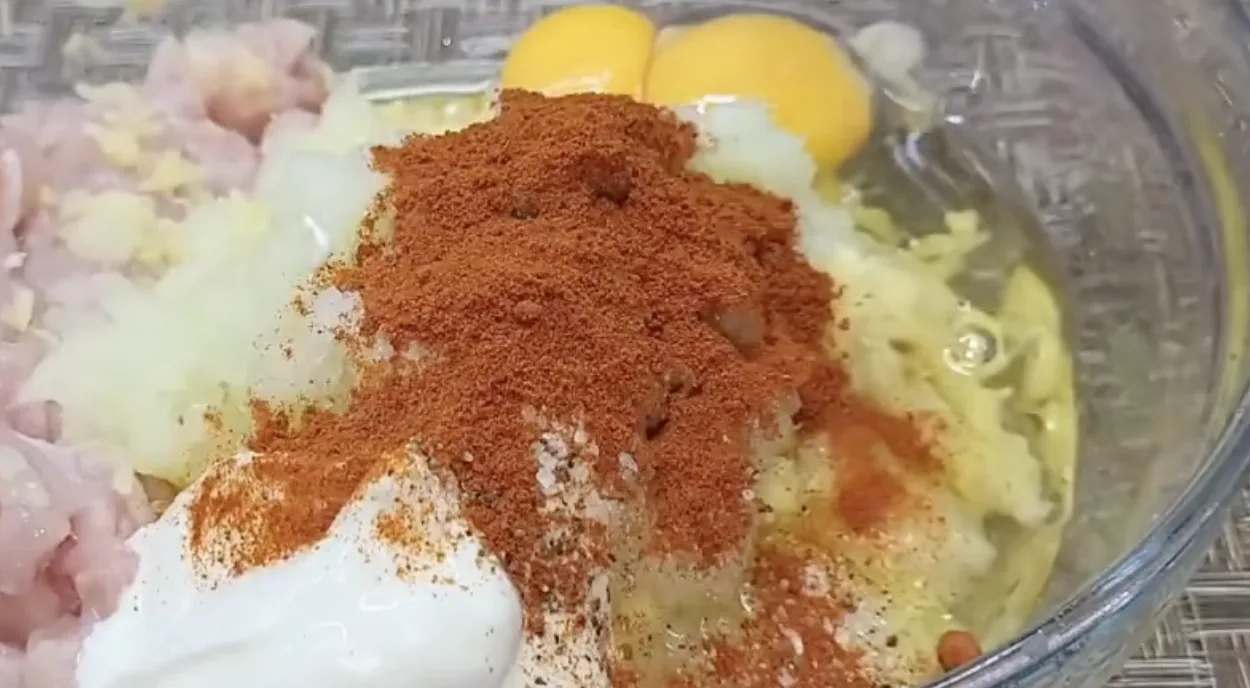 Далі все змішую: курку, картоплю, цибулю, яйця, сметану. Додаю сіль, паприку, перець, видавлюю часник. Наприкінці — борошно, щоб маса трималася купи.