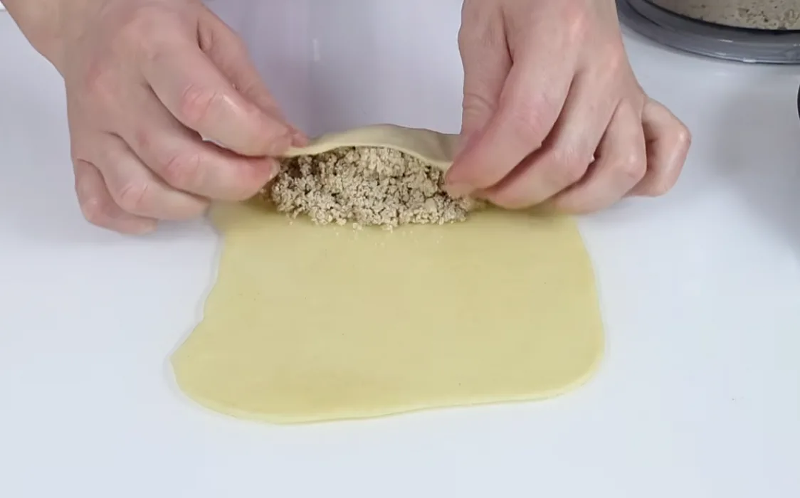 Тісто розділяємо на шматочки по 35–40 г. Розкачуємо кожен шматочок у тонкий прямокутник. Викладаємо начинку (столову ложку) та підгортаємо краї.